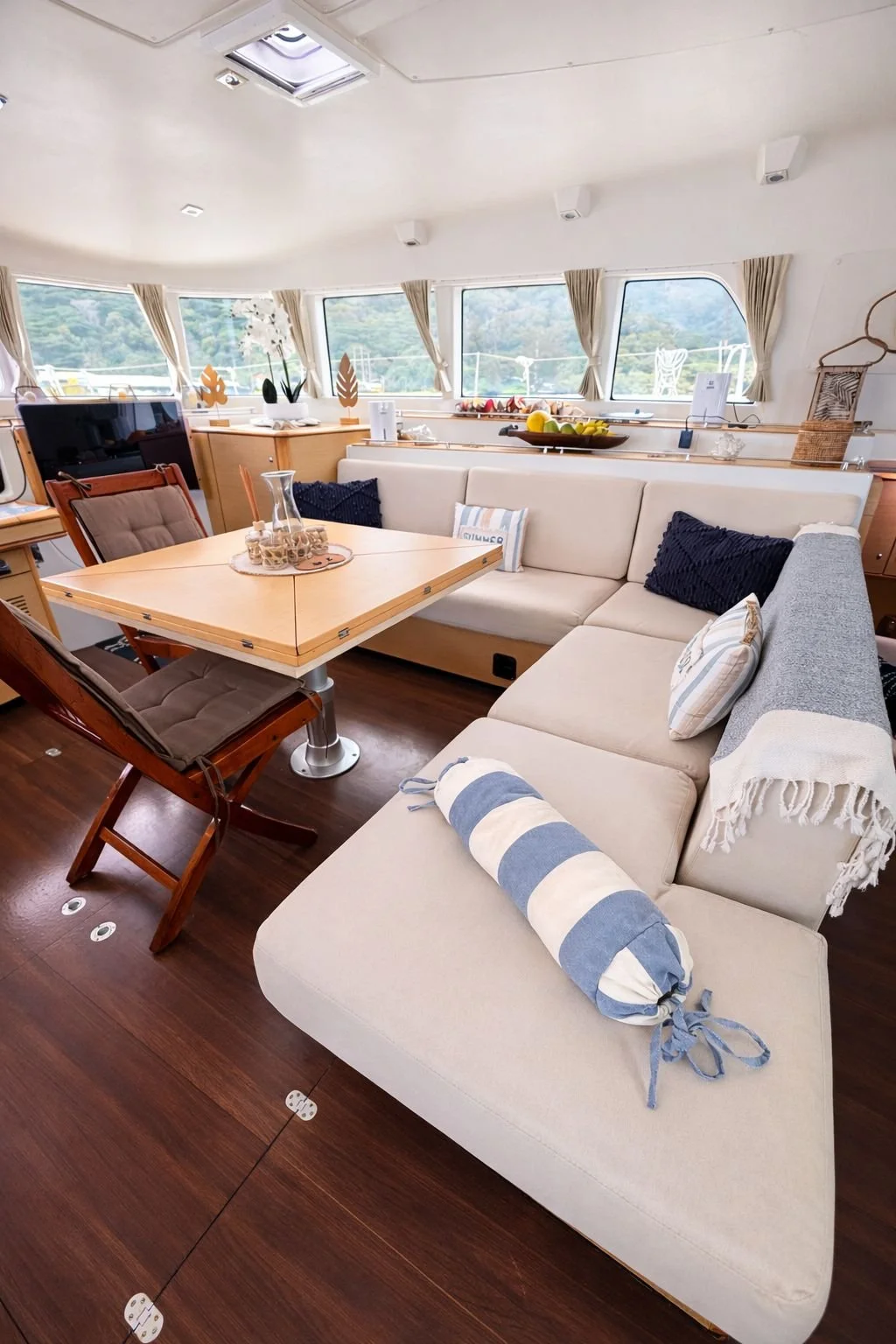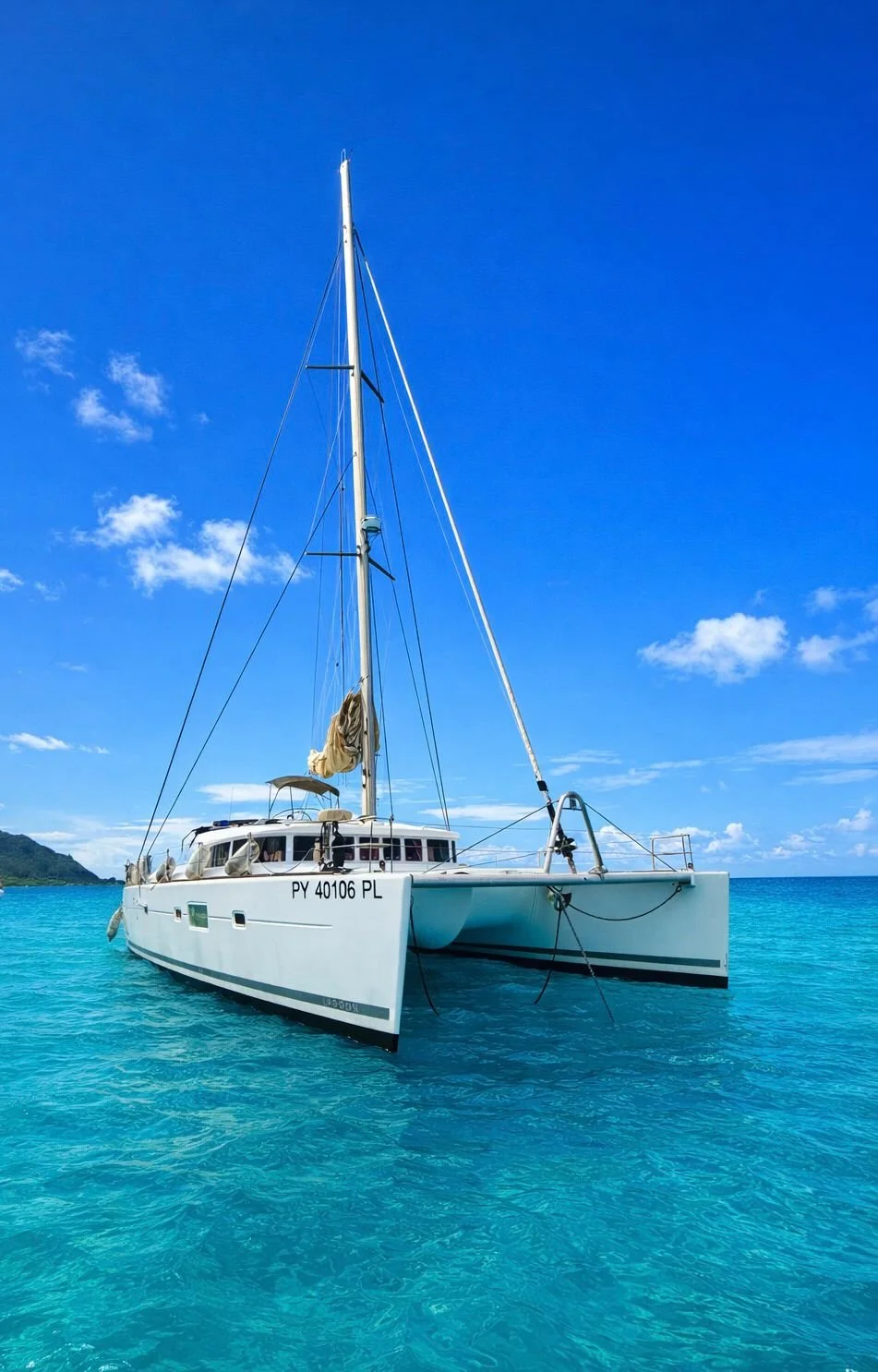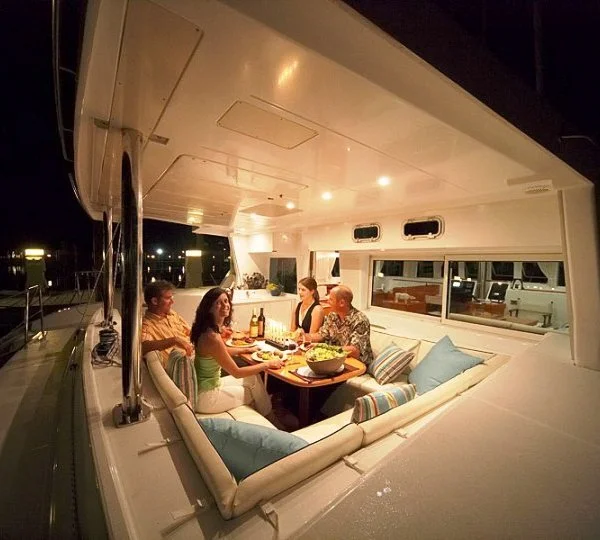 TUATAU V is our large 50 foot Lagoon Catamaran ready to entertain you for daily or overnight cruises .